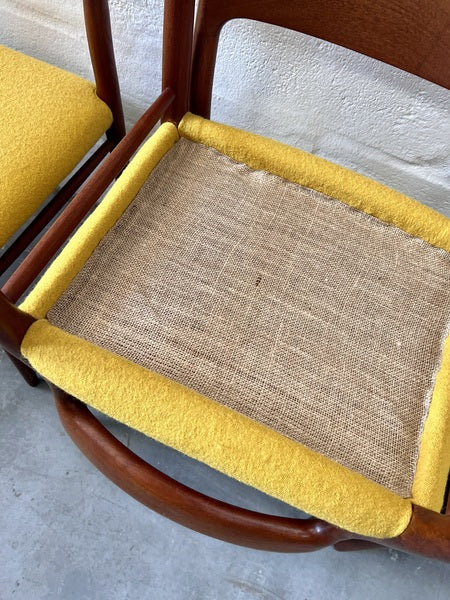 Discover timeless elegance: Four Mid Century Danish Model 75 Upholstered Dining Chairs By Niels Otto Møller for JL Møllers Møbelfabrik A set of four Model 75 chairs by Danish designer Niels Otto Møller circa 1954, and manufactured by JL Møllers Møbelfabrik chairs featuring frames made of solid teak and seating newly upholstered in mustard Minerva Wool. In fantastic vintage condition, signs of minor general wear and historic use as to be expected. Nothing of any significance to remark on. Please review the photos - happy to answer any questions. Measurements: H75cm x W50cm x D47cm Floor To Seat H51cm In 1944, Niels Otto Møller founded J.L Møllers Møbelfabrik in Denmark. J. L Møllers Møbelfabrik produces chairs of extremely high quality, in timeless designs. The chairs are sold over the whole world and the Møller chair has become the epitome of Danish design. Considered to be Niels Mollers finest work, this design has rightly become a Danish design classic. Condition report: In fantastic vintage condition, signs of minor general wear and historic use as to be expected. Nothing of any significance to remark on. Please review the photos - happy to answer any questions. Additional dimensions information: Floor To Seat H51cm